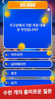 혹시 달이 어떤 물질로 이루어져 있는지 아시나요? 혹은 특정 역사적 사건의 정확한 연도는 무엇일까요? "밀리어네어 - 오프라인 상식 퀴즈 게임"은 예술, 과학, 스포츠, 역사 등 모든 분야를 아우르는 10,000개 이상의 다채로운 질문으로 가득합니다. 매주 업데이트되는 방대한 질문들은 당신의 호기심을 자극하고 끊임없는 학습의 즐거움을 선사합니다. 일상의 스트레스와 걱정을 잊고, 온 가족이 함께 유익하고 편안한 시간을 보낼 수 있는 이상적인 상식 퀴즈 게임입니다. 오프라인에서도 언제든 즐길 수 있어 더욱 편리합니다.